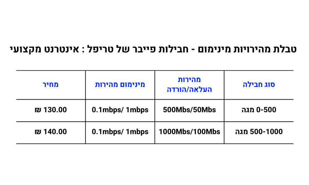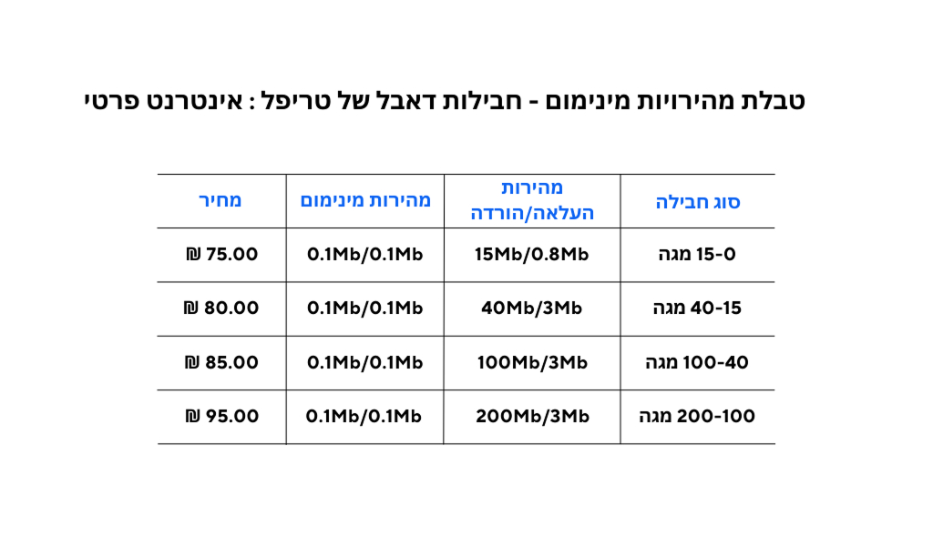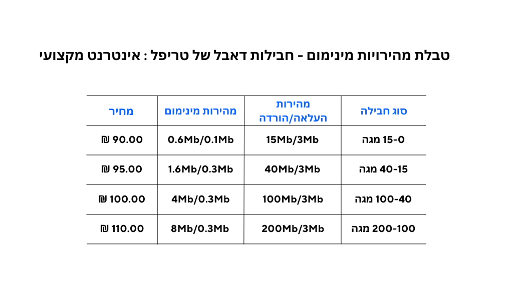 לנוחיותכם, להלן טבלאות שמחלקות את חבילות האינטרנט של טריפל סי לפי שם התוכנית, סוג חבילה ומחיר.